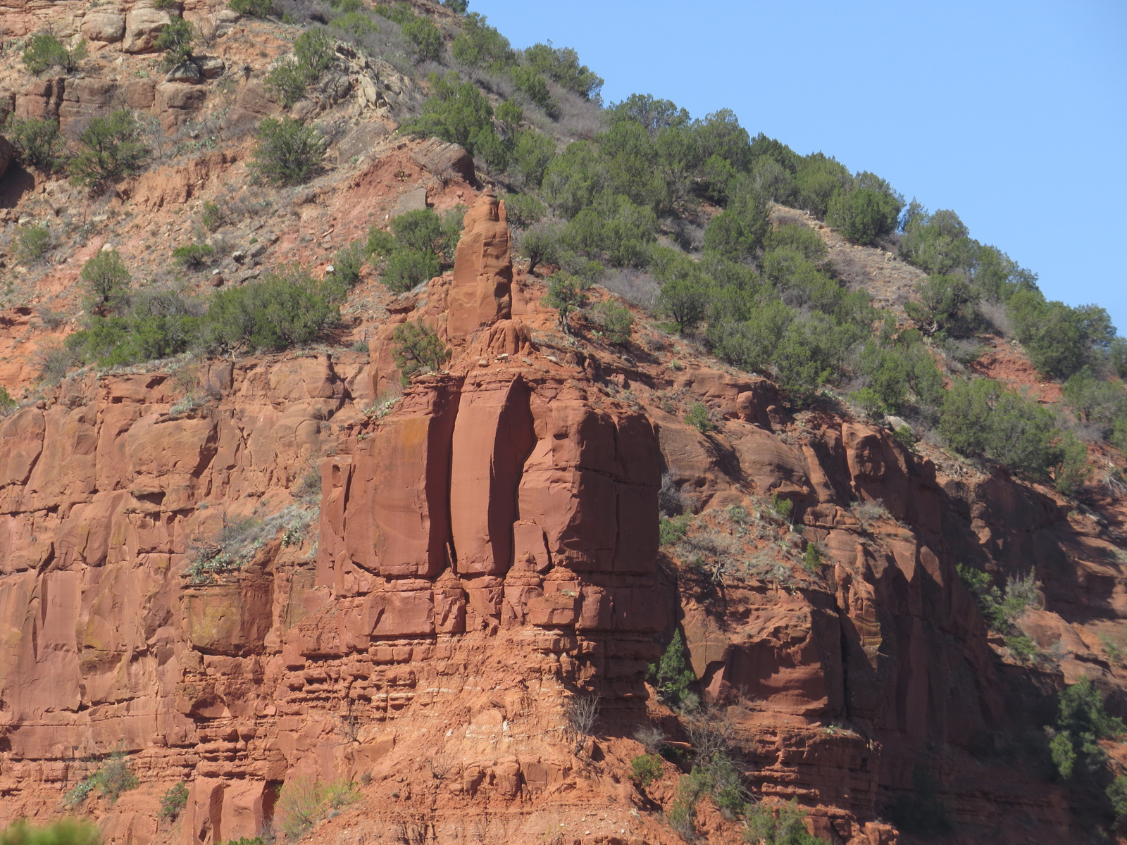 | This shot clearly shows the oldest, Permian layer, shot through with horizontal veins of gypsum at the bottom, the relatively smoothly eroded Tecovas layer on top of that, topped by the more raggedly eroded Trujillo layer. At this point in the canyon the uppermost layer, the caprock formed from the debris of the erosion of the Rocky Mountains, has already been worn away. I'm standing on the remains of the Permian Sea. Depending on how far down I actually am, on material laid down somewhere between 300 and 230 million years ago! Long before dinosaurs existed! |